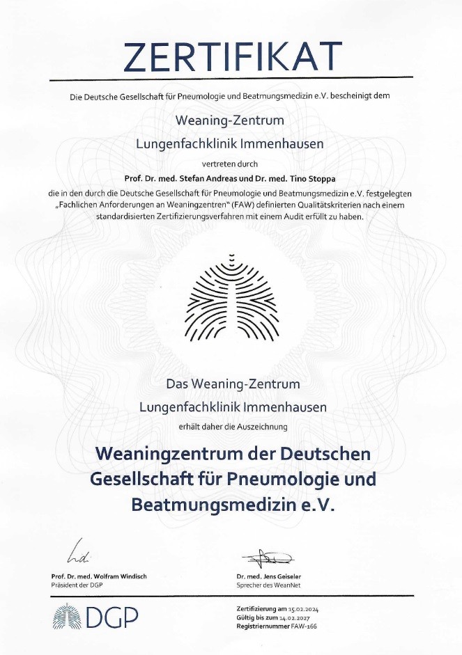 Das Weaningzentrum der Klinik wurde als erstes derartiges Zentrum in Hessen im Jahr 2010 von der DGP nach eingehender Prüfung durch zwei Gutachter zertifiziert. Die erfolgreiche Re-Zertifizierung erfolgte im Jahre 2024. Wir sind das einzige zertifizierte Weaningzentrum in Kassel und Umgebung. Durch jahrzehntelange ärztliche, pflegerische und physiotherapeutische Erfahrung sowie eine große Auswahl an Geräten und Masken bestehen hervorragende Bedingungen zu einer erfolgreichen Entwöhnung von der invasiven Beatmung. Wir übernehmen gerne Patienten aus Kliniken in Hessen sowie den umliegenden Bundesländern zur Entwöhnung von der Beatmung (Anmeldebogen).